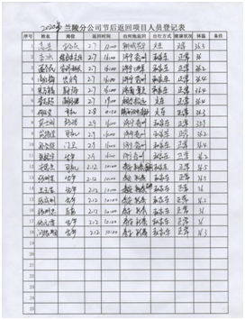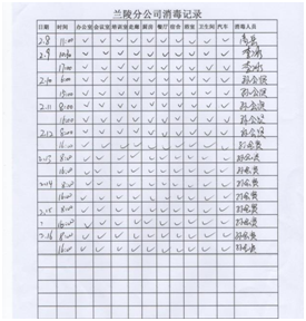 配合當(dāng)?shù)卣w溫監(jiān)測(cè) 落實(shí)措施,扎實(shí)開展防控工作。分公司設(shè)立疫情防控點(diǎn),配備防護(hù)口罩、手套、防護(hù)鏡、體溫計(jì)及測(cè)溫槍、酒精、84消毒液、噴霧器等防護(hù)物資。嚴(yán)格控制返程人員,對(duì)居住或經(jīng)過疫情防控重點(diǎn)區(qū)域人員,要求暫不返回項(xiàng)目部,居家隔離自我觀察;要求返回項(xiàng)目部人員,返程路上嚴(yán)格落實(shí)個(gè)人防控措施,制定記錄表,對(duì)返回人員嚴(yán)格檢查、登記;返回項(xiàng)目部后,在項(xiàng)目部?jī)?nèi)自行隔離14天,每天早晚測(cè)量體溫并做好記錄。    返程人員登記 每日體溫監(jiān)測(cè) 集中開展項(xiàng)目部衛(wèi)生消毒工作。分公司通過多種渠道,購(gòu)進(jìn)酒精、84消毒液等藥品,每天上午下午各進(jìn)行一次集中消毒工作,辦公室、會(huì)議室、廚房、餐廳、宿舍、衛(wèi)生間、走廊、院內(nèi)邊邊角角,全面消殺。  項(xiàng)目部消毒 消毒記錄